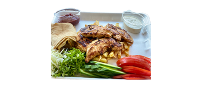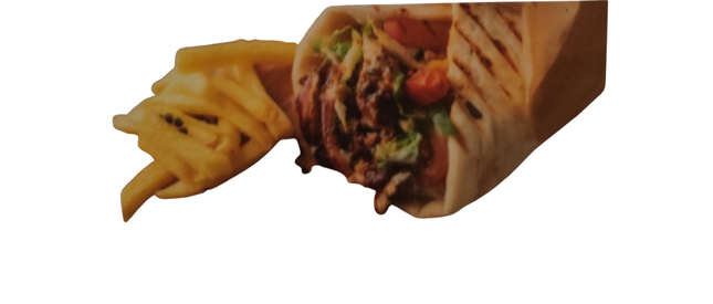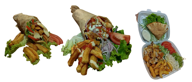 Арабска питка, пилешко бон филе, домати, краставици, зеле, маруля, лук, картофи, сосове.