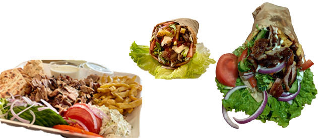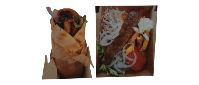Арабска питка, агнешко, телшко, домати, краставици, зеле, лук, маруля, картофи, сосове.