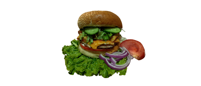 Питка за бургер, бургер кюфте, маруля, краставици, домати, лук, зеле, картофи, сосове.