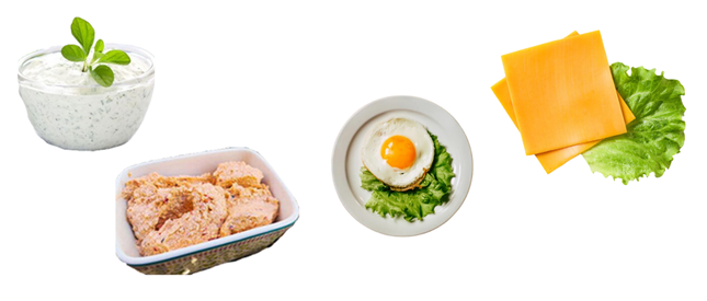 Пилешко, домати, краставици, зеле, маруля, картофи, сосове.